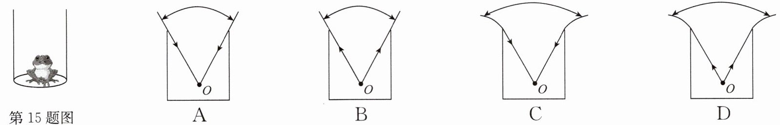 15. 如图,枯井中的青蛙位于井底O点“坐井观天”,下列图示中青蛙通过井口观察范围正确的光路图是 (