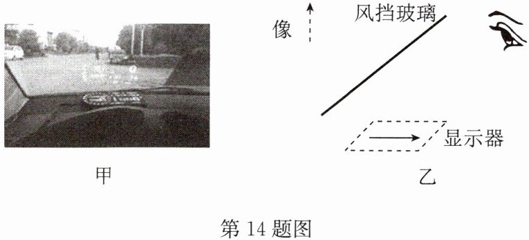 14. 汽车自带抬头显示器(如图甲所示)简称HUD.图乙是它的工作原理图,能将水平显示器上的重要行车数据通过前风挡玻璃(看成平面镜)呈现在正前方,确保驾驶的舒适安全,下列说法正确的是 (