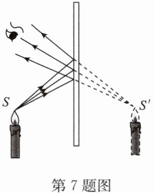 7. 如图所示,小明透过平面镜看到了蜡烛的像,下列有关平面镜成像的描述,正确的是 (