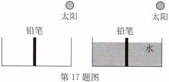 17. 为拓展研究光的折射现象,小薇同学找来两个相同的水槽,一个装水,另一个不装水. 她在两个水槽中央分别竖立一支相同的铅笔. 当阳光斜照时,观察水槽底部铅笔的影子,会发现 (