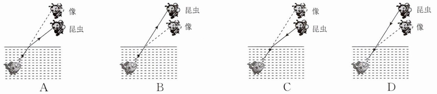2. 喷水鱼因特殊的捕食方式而得名,它能喷出一股水柱,准确击落空中的昆虫作为食物. 下列各图中能正确表示喷水鱼看到昆虫像的光路图是 (