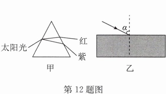 12. 图甲是太阳光通过三棱镜时发生的折射现象示意图. 在图乙中,一束红光和一束紫光先后以相同的入射角α从空气射向上下表面平行的玻璃砖的同一点,并都能从下表面射出. 下列说法正确的是 (