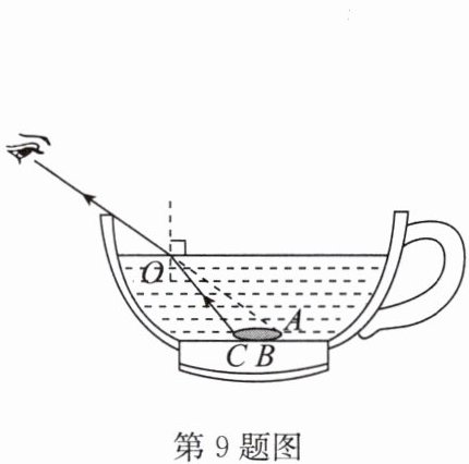 9. 如图所示,把一枚硬币固定在空杯的底部,后退直到看不到硬币的最右端A点. 保持眼睛和杯子的位置不变,逐渐向杯中加水,硬币上表面中间一点(B点)和最左端C点能先后被看到.