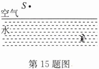 15. 潜水员在水下看到岸边的小鸟S在$S'$点,请作出潜水员在水下看到小鸟的光路图.