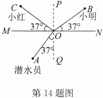 14. 如图所示,MN为水面,PQ为法线,水面下A处有潜水员,水面上方B、C处分别有小明和小红. 他们分别通过水面观察对方的像,以下说法正确的是 (