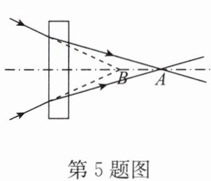 5. 如图所示,一束光线经过一个透镜后相交于主光轴上的A点,取走透镜后,光线相交于B点,则该透镜起到