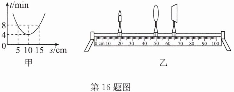 (1)小明想知道实验中凸透镜的焦距,他将镜面垂直于阳光,在凸透镜下面放上白纸(白纸与透镜平行),测出透镜到白纸间距$s与对应白纸被烤焦的时间t$,绘出了如图甲所示的图像,由图像可判断该凸透镜的焦距$f$为