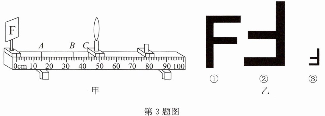 3. (2024·东台期中)如图甲所示,在“探究凸透镜成像规律”的实验中,选取焦距为10cm的凸透镜,将一个F型LED灯依次放在光具座A、B、C三点处,所成像如图乙所示,则人眼在透镜右侧观察到的像先后顺序是(