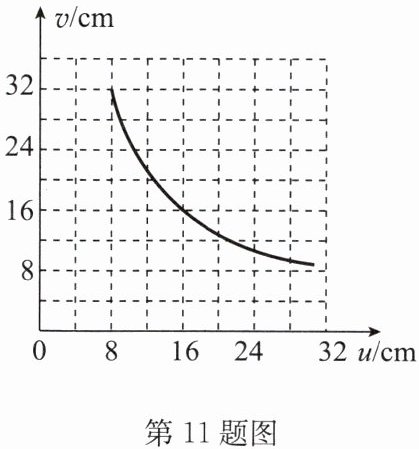 11. 某同学在“探究凸透镜成像的规律”实验中,记录并绘制了物体到凸透镜的距离$u与像到凸透镜的距离v$之间关系的图像,如图所示.下列判断正确的是(
