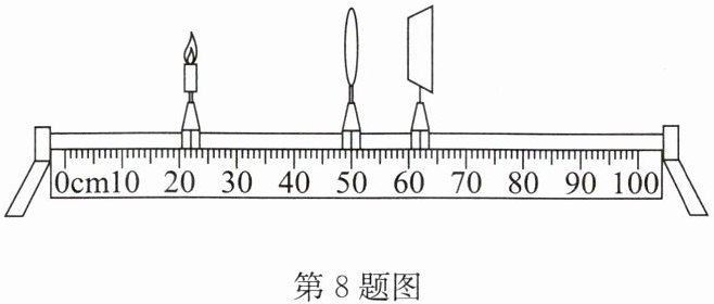 8. 小明同学在探究凸透镜成像规律时,用焦距分别为$f_{1}$、$f_{2}$的甲、乙两个凸透镜进行实验.先将点燃的蜡烛、透镜甲和光屏放置在光具座上,调整后的位置如图所示,此时在光屏上得到烛焰清晰的像(图中未标出);再用透镜乙替换透镜甲,且保持蜡烛和透镜的位置不变,将光屏向左移动再次得到烛焰清晰的像.下列判断正确的是(