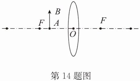 14. 请在图中画出物体AB的像$A'B'$的大概位置.注:要能正确反映像的大小、正倒和虚实,但不需要画光线图.