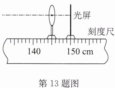 13. 如图所示,在“探究凸透镜成像的规律”时,小明将蜡烛沿主光轴由距透镜90cm移至120cm的过程中,发现烛焰在图示位置光屏上的像一直比较清晰.若他再将蜡烛移至距透镜7cm处,移动光屏,则光屏上得到的像一定是(
