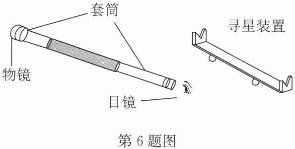 6. 如图所示是小红制作的一架简易的天文望远镜,选用的凸透镜焦距为5 cm和50 cm.她将寻星装置安装在套筒上,将望远镜固定在三角架上,用于观察月球,下列说法中不正确的是 (