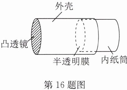 16. (2024·泰兴一模)小明用一个焦距不大的凸透镜自制了一架如图所示的成像装置,外壳的长度为$16 cm$.若将凸透镜对准窗外景物,在外壳内前后移动内纸筒,在半透明膜上可以得到景物