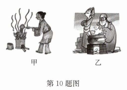 10. 如图甲、乙是“扬汤止沸”和“釜底抽薪”的两幅漫画. “扬汤止沸”是指把锅里沸腾的水舀起来再倒回去,他是通过