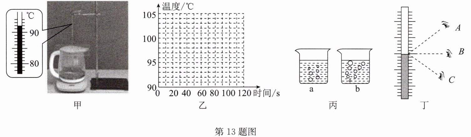 13. 小明、小红两位同学分别探究水的沸腾. 如图甲所示,向水壶中注入适量的水,闭合开关加热,观察水的温度变化和水中发生的现象.