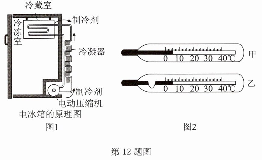 12. 如图1所示是电冰箱工作原理图.电冰箱工作原理是利用了一种制冷剂作为热的“搬运工”,把冰箱冷冻室里的“热”搬运到冰箱外边.