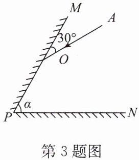 3. 如图所示,两块平面镜相交,一束光线沿 $ AO $ 斜射到平面镜 $ MP $ 上,并且与平面镜的夹角为 $ 30^{\circ} $,光线经两平面镜反射后与 $ AO $ 重合,但方向相反,则两块平面镜的夹角 $ \alpha $ 是 ( )