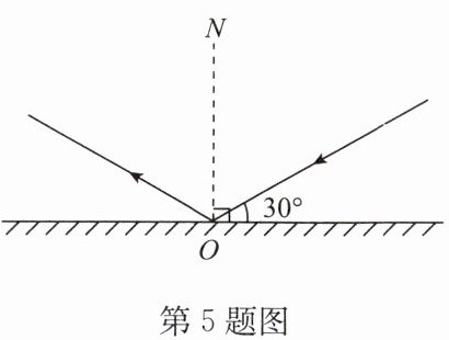 5. 如图所示,入射光线与平面镜的夹角是 $ 30^{\circ} $,则反射角是