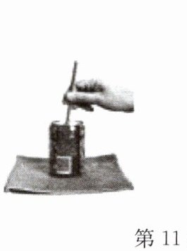11. 如图所示,将冰块放于易拉罐中并加入适量的盐,用筷子搅拌大约半分钟,用温度计测量易拉罐中冰与盐水混合物的温度,可以看到混合物的温度低于$0^{\circ }C$. 这时观察易拉罐的下部和底部,就会发现白色冰晶. 冰晶是空气中的水蒸气