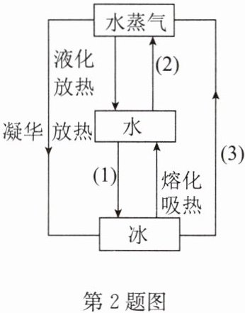 2. 如图所示是水的循环示意图,请补充完成图中三处数字所对应的物态变化名称及吸、放热情况. (1)