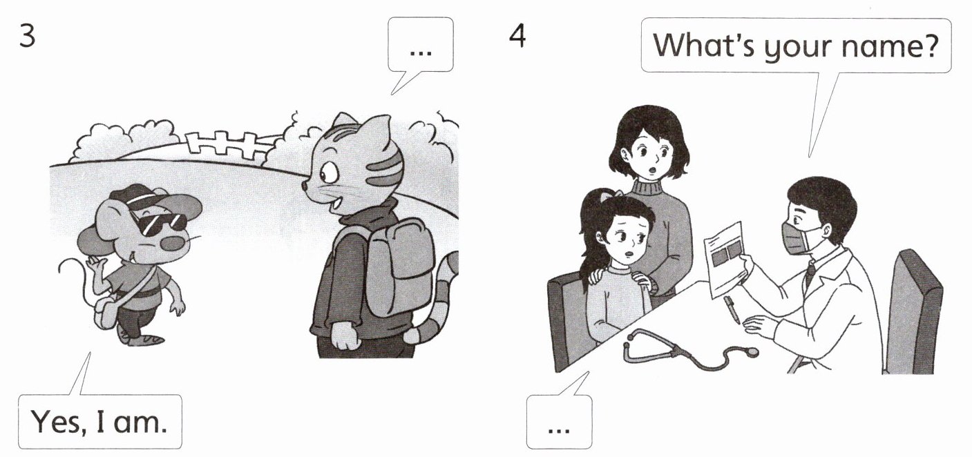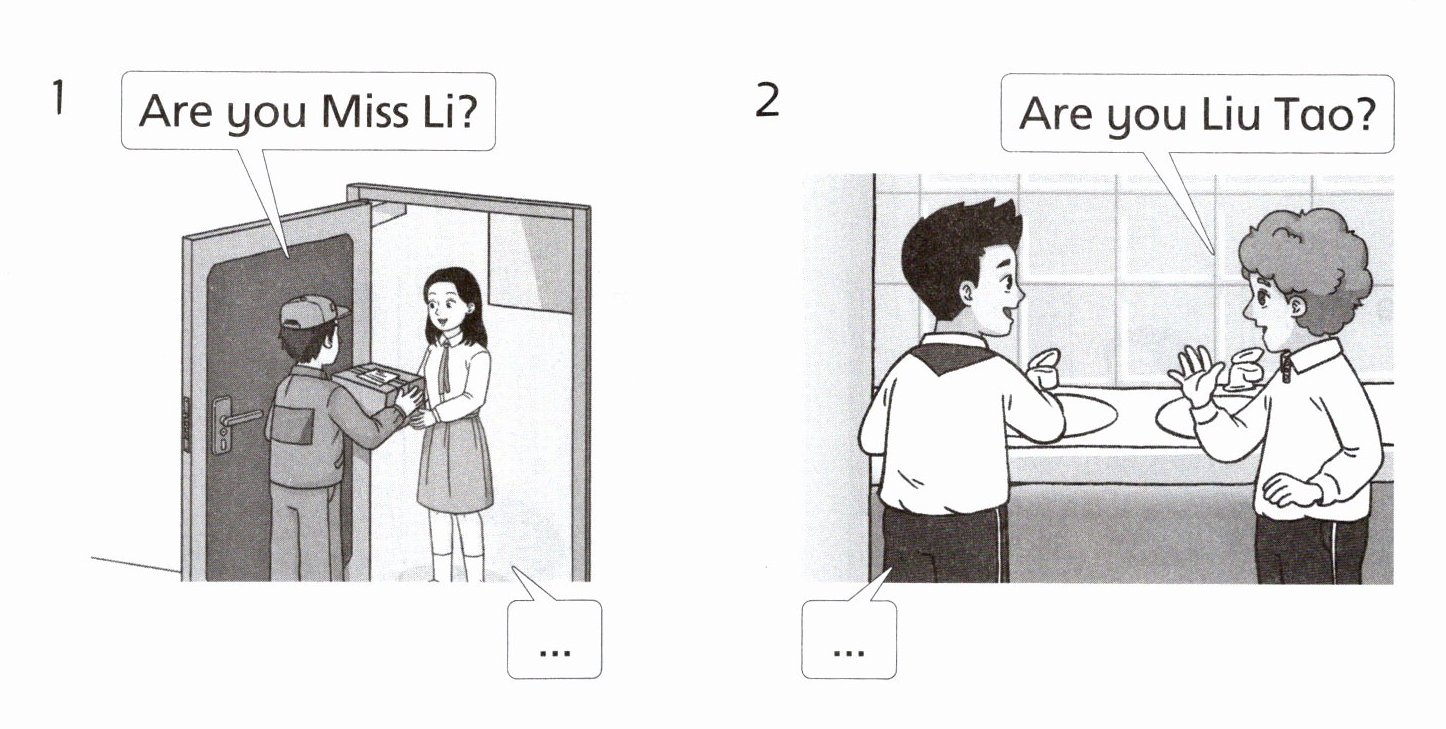 【解析】:这是一道英语看图说话的题目,考查学生对英语日常用语的理解和运用能力,以及观察图片获取信息并进行表达的能力。解题关键在于准确识别图片中的人物和对话情境,然后用合适的英语句子进行回答。