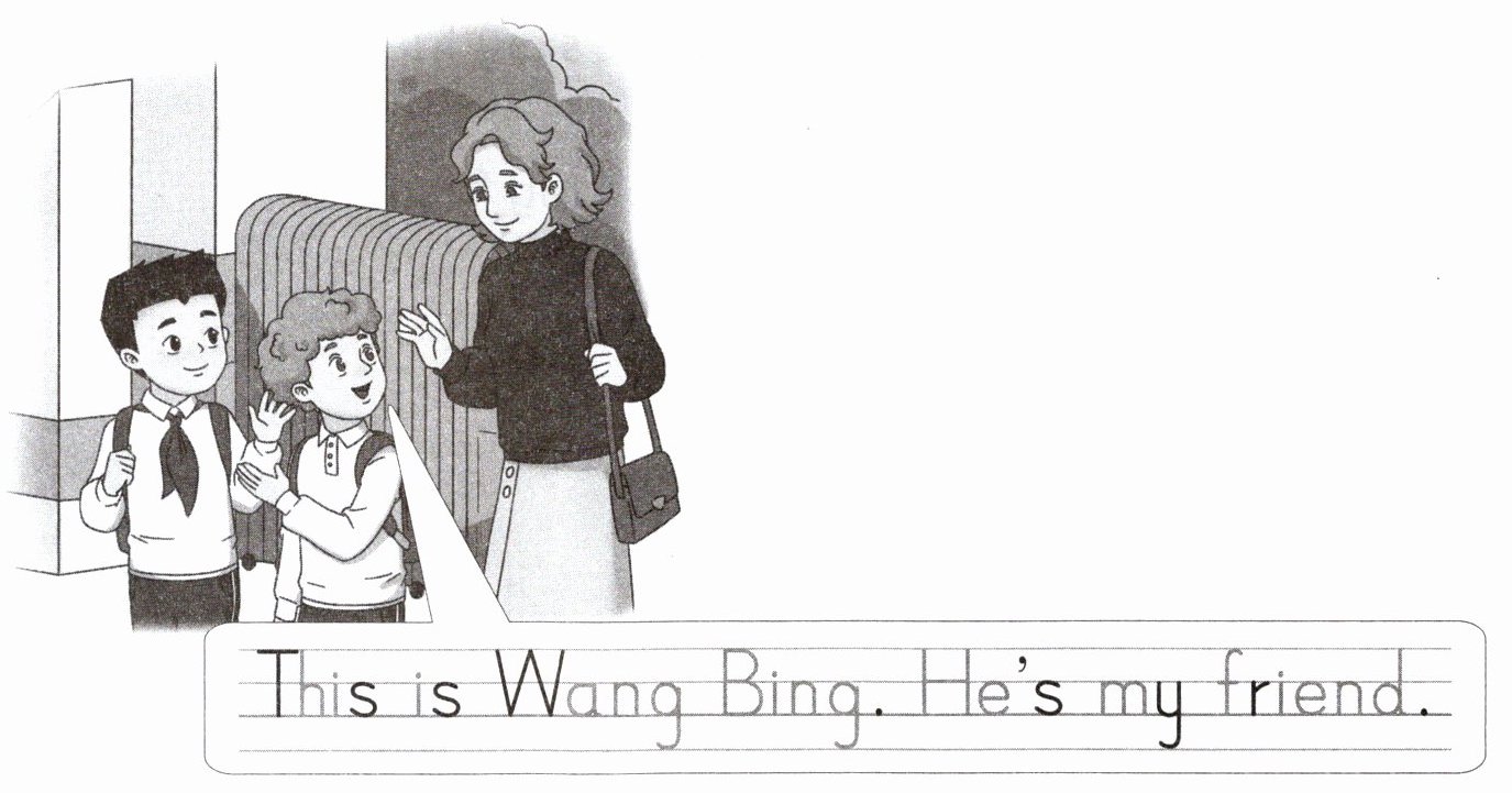这是一道英语阅读理解与书写练习题,考查学生对英语句子“This is Wang Bing. He's my friend.”的认读和书写能力。题目要求“Read and trace”,即先读句子,然后进行描摹书写。对于三年级学生来说,主要需要掌握句子的正确读音,并按照规范的书写格式进行描摹。