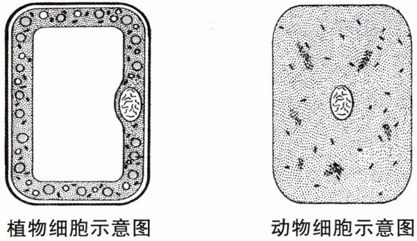 (2)在下图中标注出动植物细胞结构的主要差异。