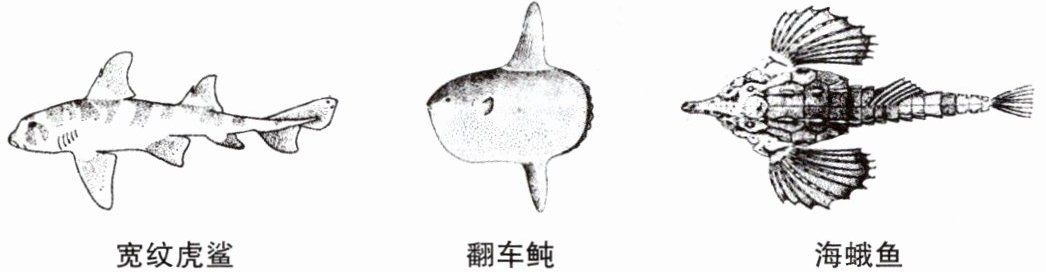 1. (单选题)下图中的动物形态各异,但都属于鱼类。它们结构上的共同特点不包括( )