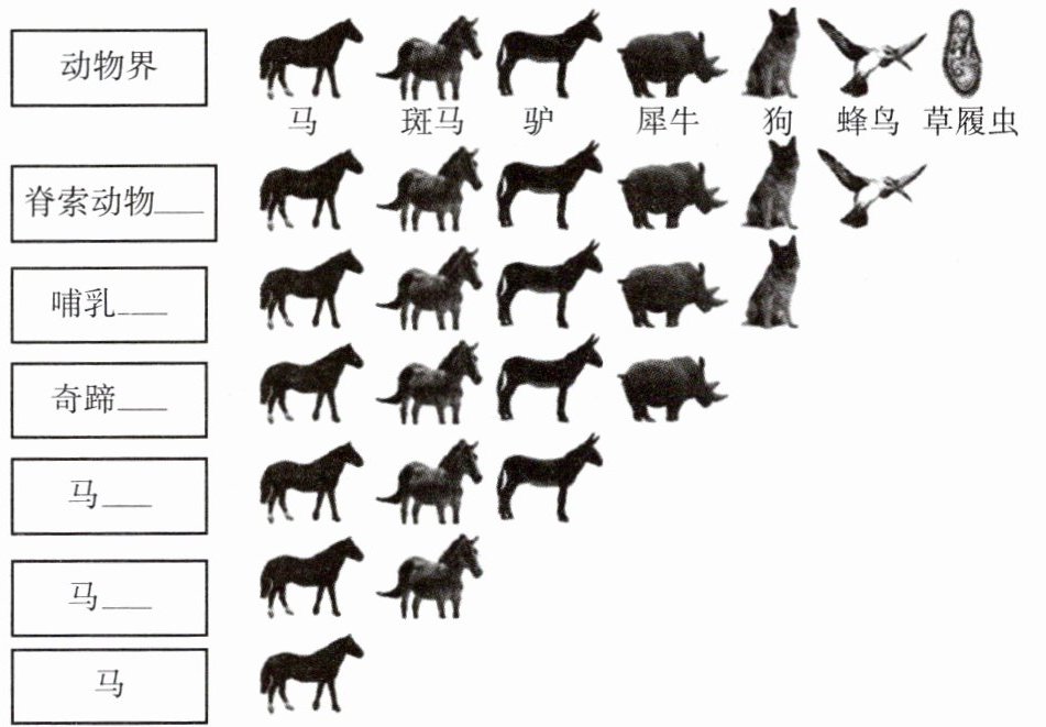 1. 请将下列动物的系统分类示意图中空缺的分类等级填写完整。