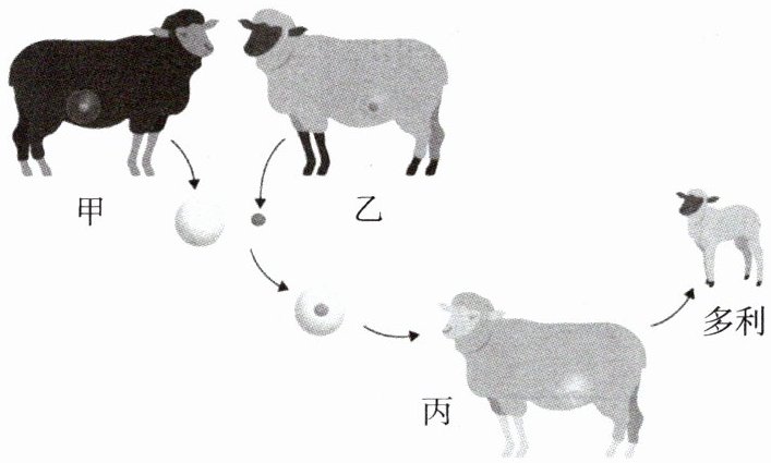 2. 1996年,多利羊在英国的罗斯林研究所里诞生,轰动了世界,原因是它与其他刚出生的羊很不相同。多利羊与羊甲、羊乙和羊丙都有关系:羊甲提供了一个去核的卵细胞,羊乙提供了乳腺细胞的细胞核,羊丙代孕并产下了多利羊(如下页图所示)。
