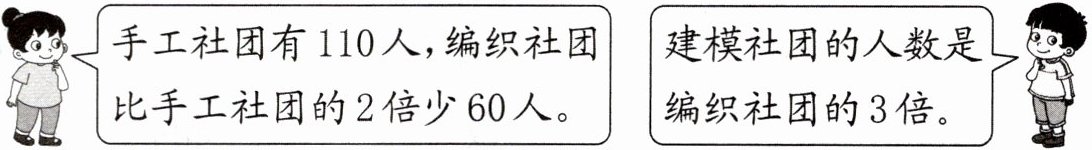 手工社团有110人,编织社团比手工社团的2倍少60人。 建模社团的人数是编织社团的3倍。