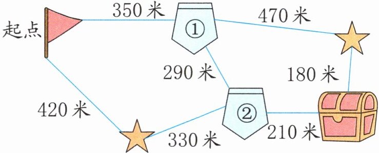 (2) 如果两个关卡处的问题天天都能答对,那么他的寻宝路线最短是多少米?将路线涂一涂。