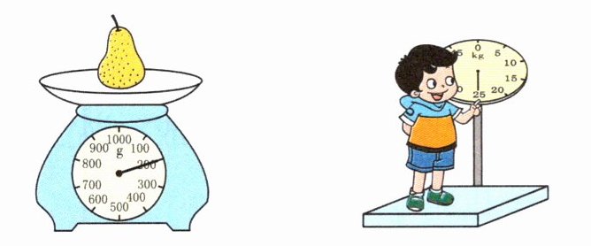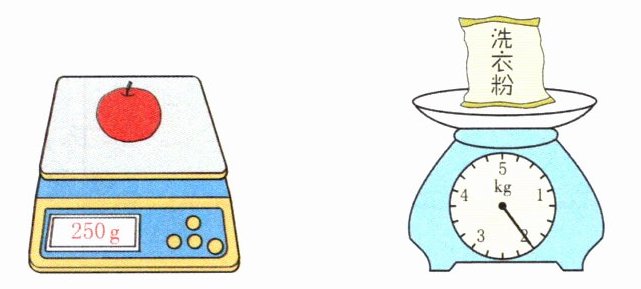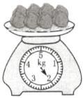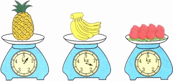5. 依依想买$4 kg$水果,再买多少千克桃就正好够了?画出最后一个台秤上指针的位置。