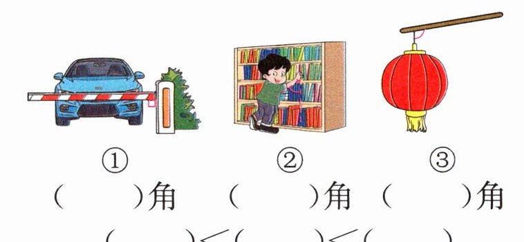2.(生活应用)下面生活中形成的角分别是什么角?把这些角按从小到大的顺序排一排(填序号)。