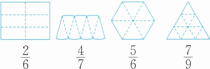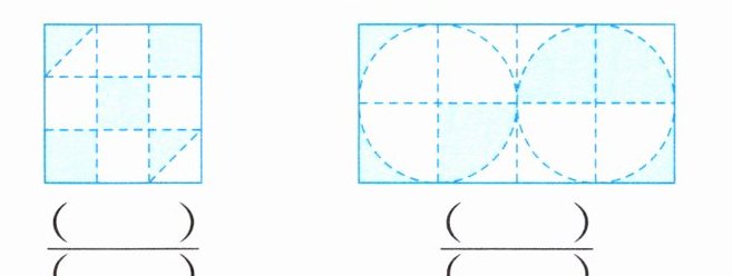 6. $\frac{4}{9}$ $\frac{3}{8}$ 解析:先通过拼组将涂色部分组合在一起,再观察涂色部分占整个图形的几分之几。