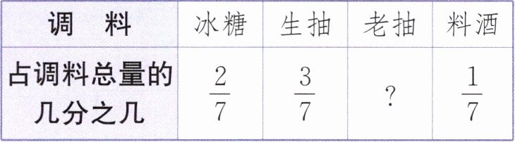 $\frac{3}{7} - \frac{1}{7} = \frac{2}{7}$ 生抽用得多,多占调料总量的$\frac{2}{7}$