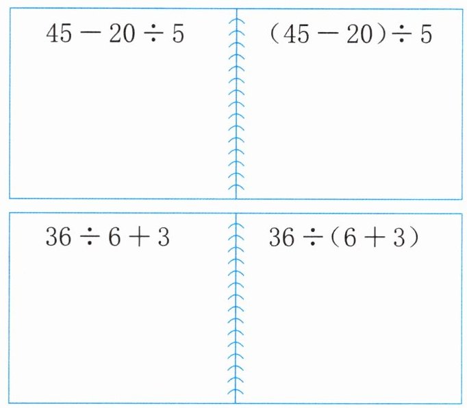 $\begin{array}{cccc}&45 - 20 ÷ 5&&(45 - 20) ÷ 5\\ &&&\\ \hline&&&\\ &36 ÷ 6 + 3&&36 ÷ (6 + 3)\end{array}$