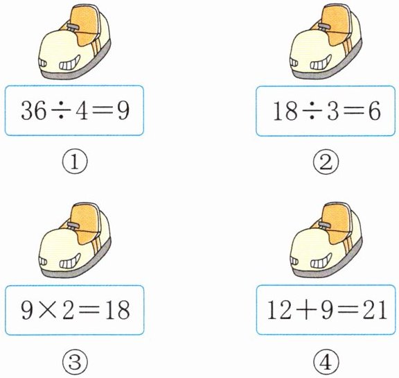 4. (思维过程) 下面哪两辆碰碰车可以“碰”出一个综合算式?先填序号,再列式。