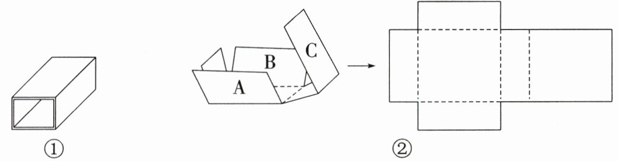 )条边;将一个长方体纸盒,按如图②所示的方法剪开展平,请在展开图中标出 A、B、C 三个面的位置。