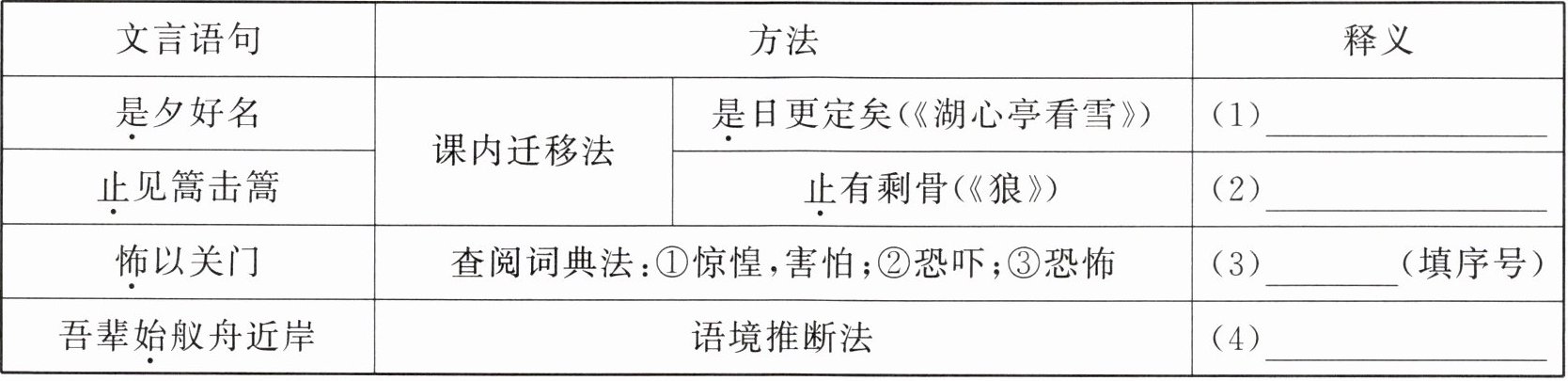 | 是夕好名 | 课内迁移法:是日更定矣(《湖心亭看雪》) | (1)___ |