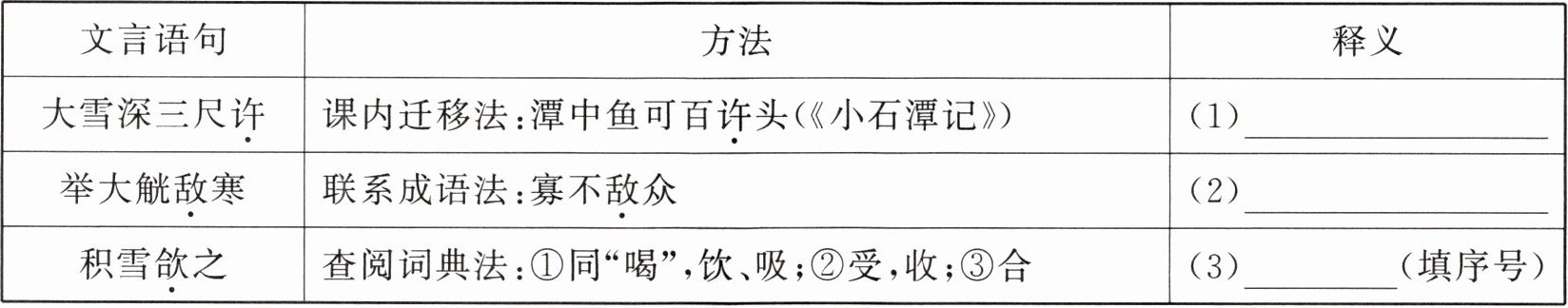 | 大雪深三尺许 | 课内迁移法:潭中鱼可百许头(《小石潭记》) | (1)___ |