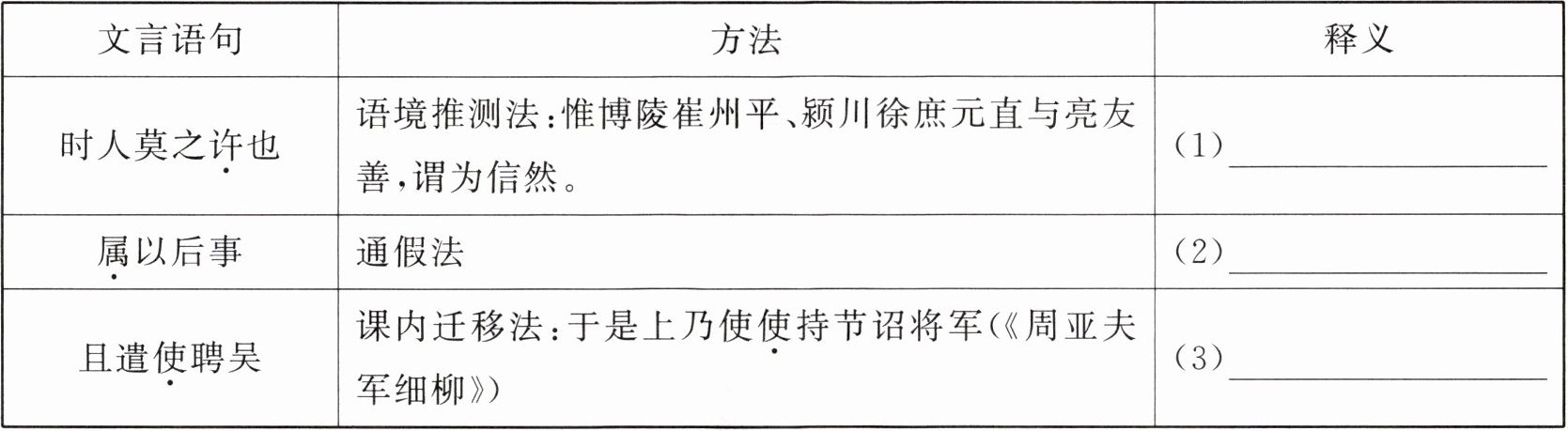 |且遣使聘吴|课内迁移法:于是上乃使使持节诏将军(《周亚夫军细柳》)|(3)______|