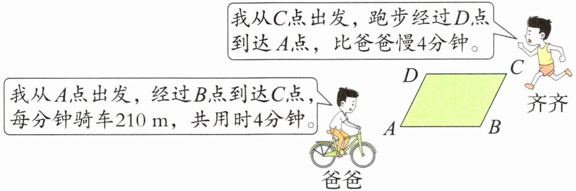 4.(宁波海曙真题)下图是一块平行四边形草坪,爸爸和齐齐沿着不同的路线到达各自的目的地,根据他们的对话计算齐齐跑步的速度是多少。