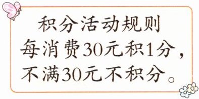 200÷30 = 6(分)……20(元) 可以积6分 30 - 20 = 10(元)