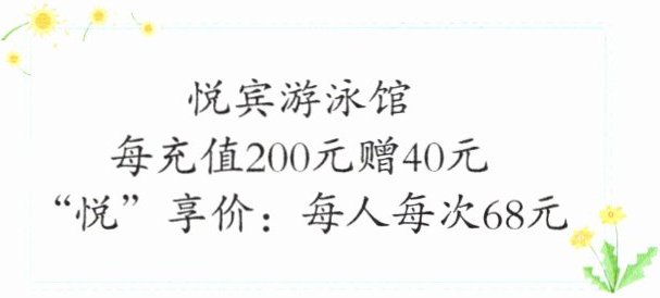 2. (生活情境)果果和妈妈到悦宾游泳馆游泳。充值卡里原来有38元,妈妈又充值了200元。现在充值卡里的钱够果果游几次?
