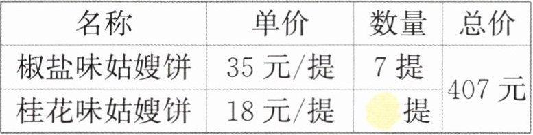 4. (地域美食)姑嫂饼是浙江桐乡乌镇的传统名吃。张阿姨购买了椒盐味和桂花味两种口味的姑嫂饼,但她不小心把单据弄脏了,你知道张阿姨买了几提桂花味姑嫂饼吗?