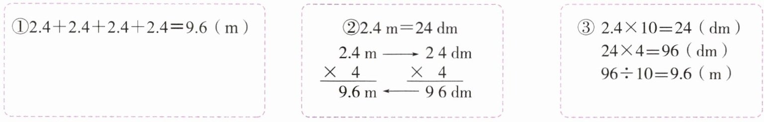 $\begin{array}{r} 2.4m\\ ×4\\ \hline 9.6m\end{array} \xrightarrow{} \begin{array}{r} 24dm\\ ×4\\ \hline 96dm\end{array}$