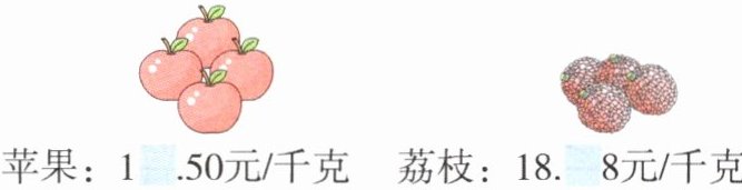 4. (台州三门真题)如图,每种水果的单价都被挡住了一个数字。黄阿姨带了80元钱,买了2kg荔枝后,剩下的钱够买5kg苹果吗? (建议用估算的方法解答)