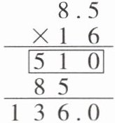 2. 1本故事书售价$8.5$元,买$16$本故事书要多少元? 如图,用竖式解决问题时,方框中的数表示(